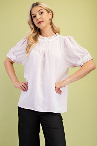 Ruffle Trimmed Peter Pan Collar Blouse with Puff Sleeves and Covered Buttons